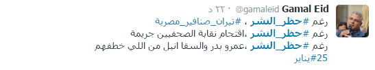 وقال الحقوقي جمال عيد: “رغم حظر النشر تيران وصنافير مصرية، اقتحام نقابة الصحفيين جريمة، عمرو بدر والسقا أنبل من اللي خطفهم”.