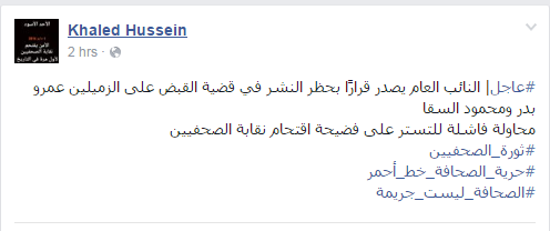 تداول عدد من رواد موقعا التواصل الاجتماعي “تويتر” و”فيس بوك” هاشتاجا بعنوان “حظر النشر”، عقب البيان الصادر بشأن قضية ضبط الزميلين عمرو بدر ومحمود السقا من داخل نقابة الصحفيين.