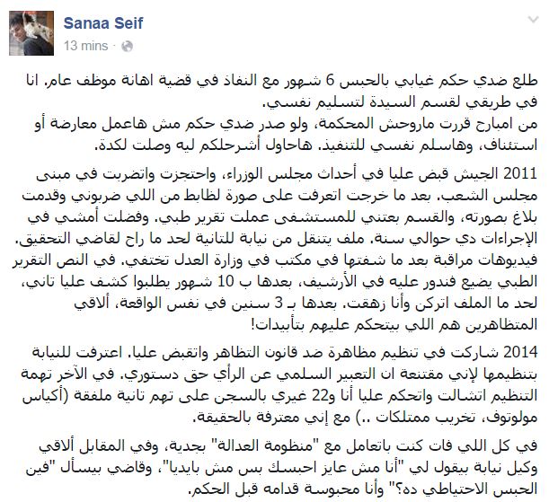 وأضافت سناء “2014 شاركت في تنظيم مظاهرة ضد قانون التظاهر واتقبض عليا، اعترفت للنيابة بتنظيمها لإني مقتنعة إن التعبير السلمي عن الرأي حق دستوري، في الآخر تهمة التنظيم اتشالت واتحكم عليا أنا و22 غيري بالسجن على تهم تانية ملفقة (أكياس مولوتوف، تخريب ممتلكات..) مع إني معترفة بالحقيقة”.