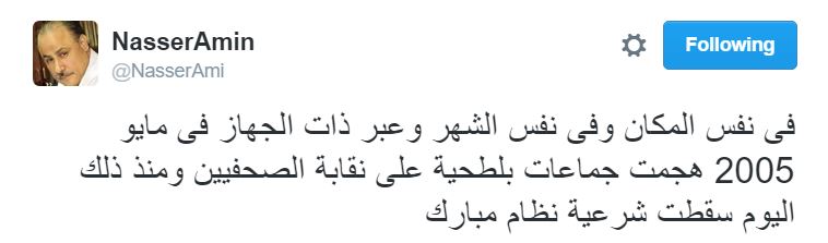 وأضاف “أمين”، “في نفس المكان وفي نفس الشهر وعبر ذات الجهاز في مايو 2005 هجمت جماعات بلطحية على نقابة الصحفيين ومنذ ذلك اليوم سقطت شرعية نظام مبارك”.