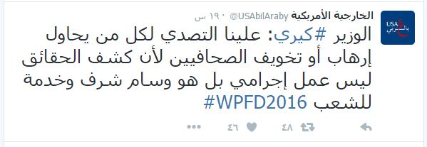 طالب وزير الخارجية الأميركي، جون كيري، بضرورة التصدي لكل من يحاول إرهاب أو تخويف الصحفيين؛ حيث قال، حسب صفحة وزارة الخارجية الأميركية، على موقع التدوين المصغر “تويتر”: “علينا التصدي لكل من يحاول إرهاب أو تخويف الصحفيين لأن كشف الحقائق ليس عملًا إجراميًا بل هو وسام شرف وخدمة للشعب”.
