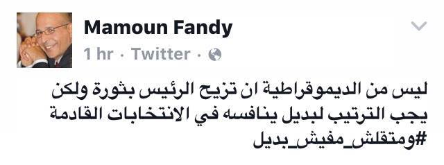 وقال -عبر تغريدة له على “تويتر”-: “ليس من الديمقراطية أن تزيح الرئيس بثورة ولكن يجب الترتيب لبديل ينافسه في الانتخابات القادمة”، وأضاف “ومتقلش مفيش بديل”.