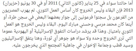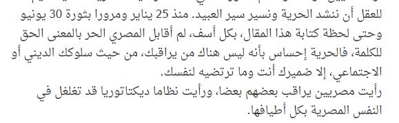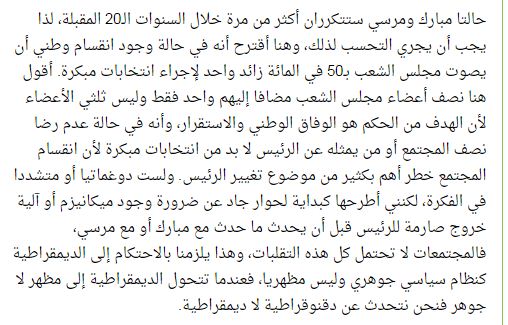 كما وصف -في مقال “ثورة أم انهيار بيت قديم” والذي نشر في فبراير 2014- نظام “مرسي” بأنه نظام ديكتاتوري تغلغل في النفس المصرية بكل أطيافها وكان لا بد من عزله، وذلك على الرغم من أن نظام مرسي لم يمر عليه أكثر من عام عبر الصناديق، مما يبدو مغايرًا لما يراه الآن من أن يعتاد الشعب على استمرار الرئيس فترة رئاسية كاملة.