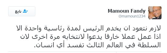 وأتبع “فندي” تغريدته السابقة بتغريدة أخرى، رأى فيها أن الشعب لا بد وأن يعتاد على أن يستمر الرئيس مدة رئاسية كاملة، إلا إذا عمل عملًا خارقًا يدعو لانتخابه مرة أخرى.