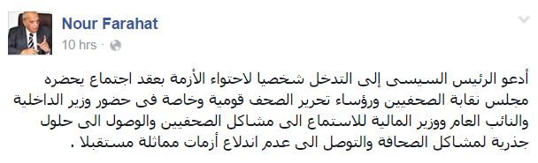 وقال -عبر منشور له على “فيس بوك”-: “أدعو الرئيس السيسي إلى التدخل شخصيًا لاحتواء الأزمة بعقد اجتماع يحضره مجلس نقابة الصحفيين ورؤساء تحرير الصحف -قومية وخاصة- في حضور وزير الداخلية والنائب العام ووزير المالية، للاستماع إلى مشاكل الصحفيين والوصول إلى حلول جذرية لمشاكل الصحافة والتوصل إلى عدم اندلاع أزمات مماثلة مستقبلًا”.