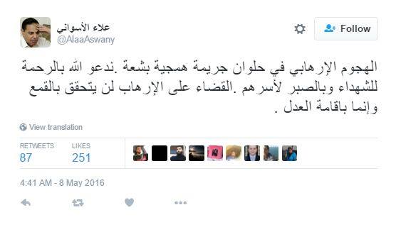 وقال “الأسواني” -عبر حسابه على موقع التواصل الاجتماعي “تويتر”-: “إن الهجوم الإرهابي في حلوان جريمة همجية بشعة”، داعيًا للشهداء بالرحمة والصبر لأسرهم، مضيفًا “القضاء على الإرهاب لن يتحقق بالقمع وإنما بإقامة العدل”.
