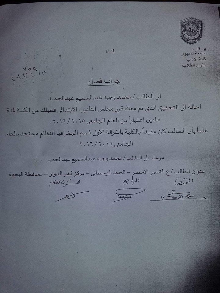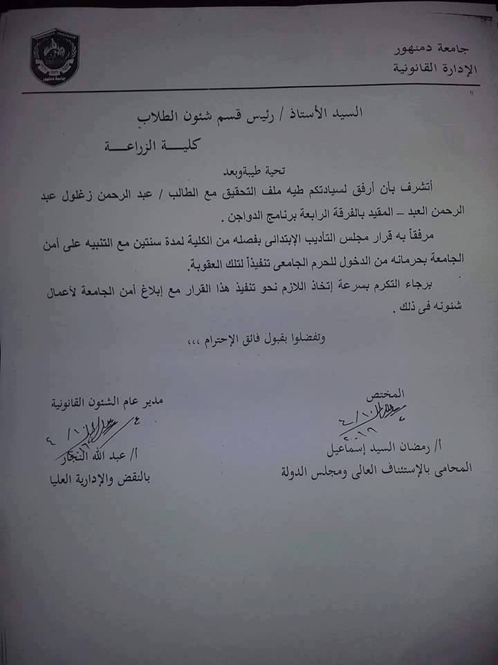 أصدر الدكتور عبيد عبدالعاطي صالح، رئيس جامعة دمنهور، المعين بقرار مباشر من عبدالفتاح السيسي، بداية العام الدراسي الحالي، قراراً بفصل طالبين لمدة عامين بتهمة التظاهر بجامعة دمنهور.