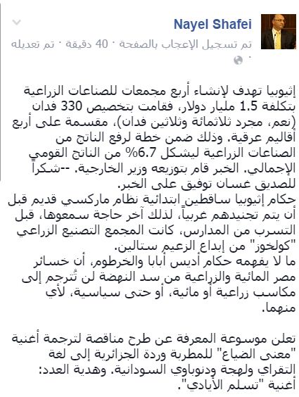 أعرب نائل الشافي، مدير موسوعة “معرفة” الإلكترونية، عن دهشته من وضع إثيوبيا لخطة لرفع الناتج من الصناعات الزراعية ليشكل 6.7% من الناتج القومي الإجمالي.
