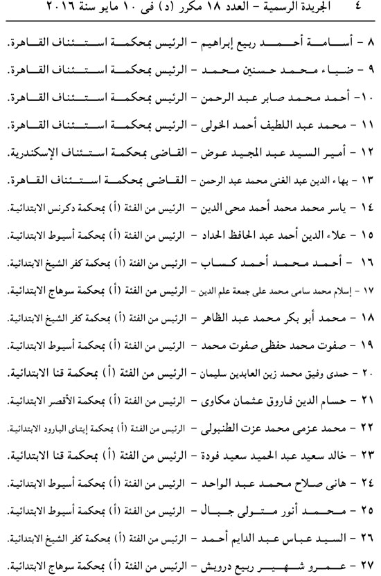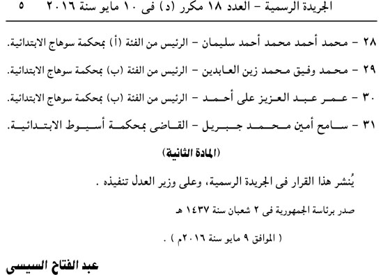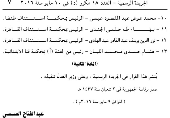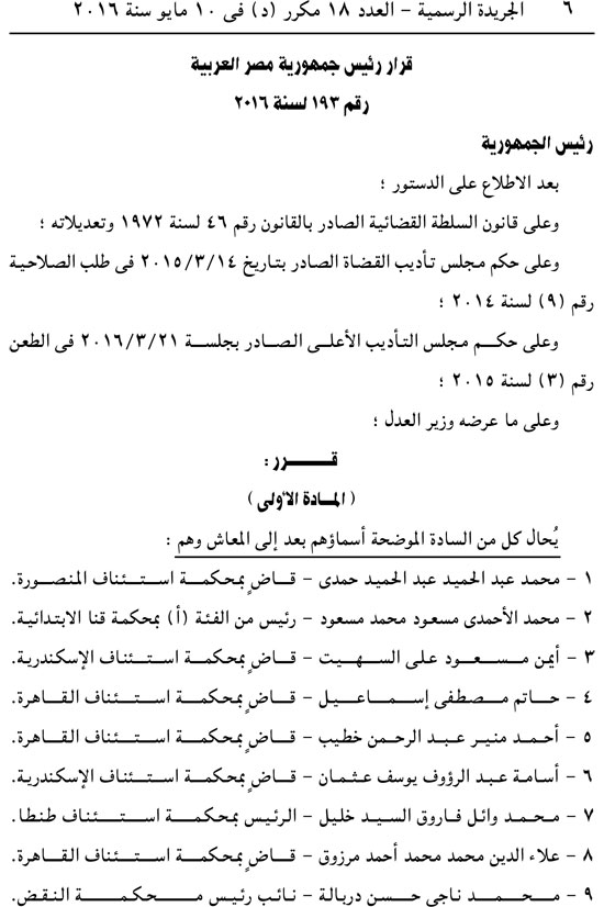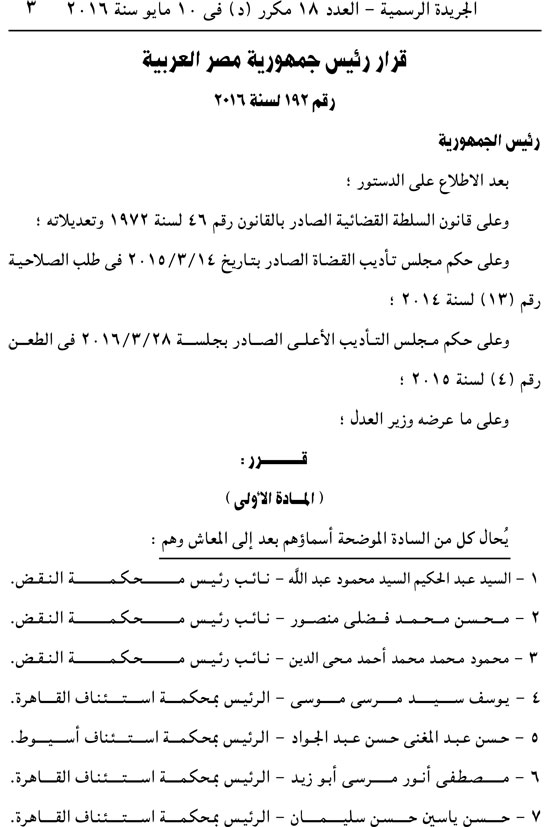 أصدر عبد الفتاح السيسي القرارين الجمهوريين رقمي 192 و193 لسنة 2016 بإحالة 44 قاضيًا على المعاش.