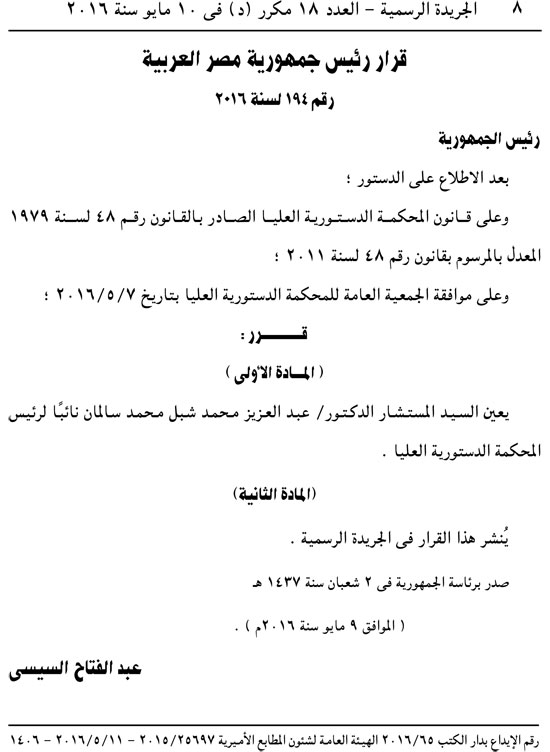 كما أصدر القرار رقم 194 لسنة 2016، بتعيين المستشار الدكتور عبد العزيز محمد شبل محمد سالمان، نائبًا لرئيس المحكمة الدستورية العليا.