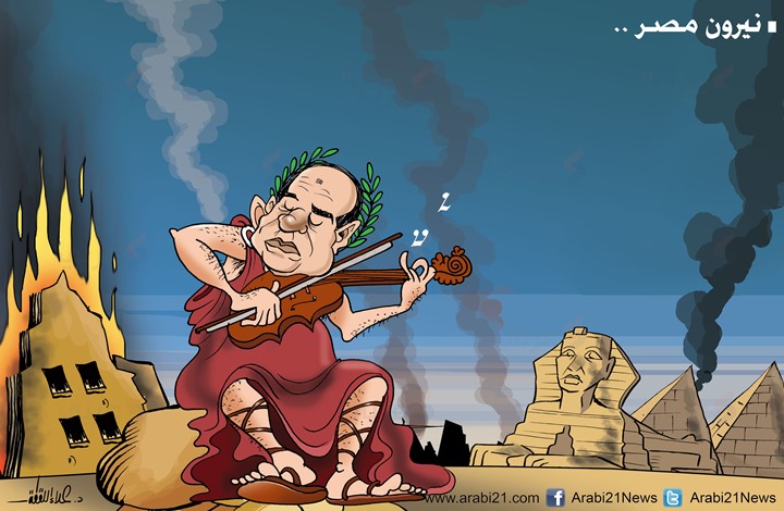 ونشر موقع “عربي 21” رسما صور السيسي بنيرون مصر الذي يستمتع بإحراق مصر