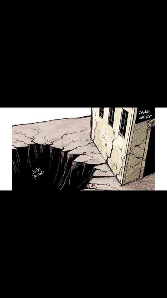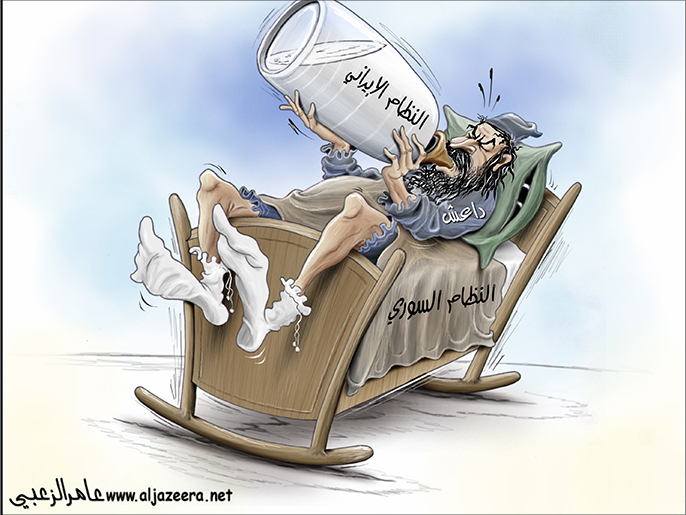 وهذا الكاريكاتير يوضح اتساع الأزمة السورية وآثارها بحدوث تشققات في صفوف قيادات حزب الله
