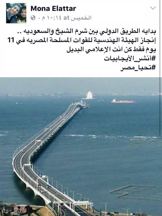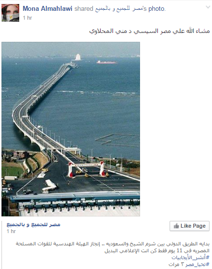 وروج مؤيدو السيسي مؤخرا صور لكوبري ونفق في اليابان إسمه “Tokyo Bay Aqua-Line” وتم تنفيذه منذ 9 سنوات، وقالوا أنه الطريق الدولي الذي سيربط بين شرم الشيخ والسعودية.