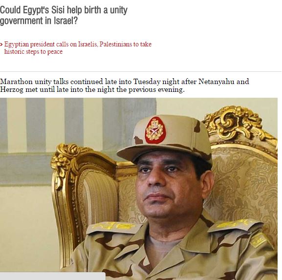 وأضافت: إن حزبي “الليكود” ،والعمل أعربا عن شكرهما لجهود السيسي في المساعدة في تشكيل الحكومة الجديدة خلف الكواليس ، وفي العلن عن طريق خطاب له أكد فيه بالتزامه بالمساهمة في جهود السلام الإسرائيلية الفلسطينية ، حيث أكد مسئولون “إسرائيليون” للقناة العاشرة الإسرائيلية أنه في حال نجاح تشكيل الوحدة الوطنية الإسرائيلية فإن رئيس الوزراء الإسرائيلي ،وزعيم حزب العمال”هرتسوج” سيتجهان إلى مصر لإطلاق مبادرة سلام جديدة تحت قيادة السيسي .