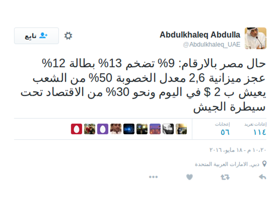 نشر الأكاديمي الإماراتي الدكتور عبدالخالق عبدالله، مستشار ولي عهد أبو ظبي، تويتة بعنوان “حال مصر”، تتضمن عددا من النسب المئوية حول أوضاع مصر الاقتصادية.