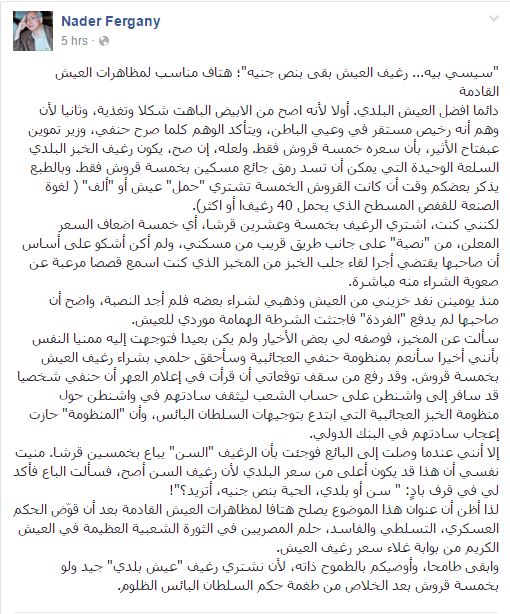 يقول فرجاني عبر منشور له على صفحته بموقع التواصل الاجتماعي “فيسبوك”: منذ يومين، لم أجد من أشتري منه الخبز، فقررت الذهاب للمخبز، متمنيًا أن أحظى بالاستفادة من منظومة الخبز ذي الـ”5 قروش” الذي يتحدث عنه وزير التموين.