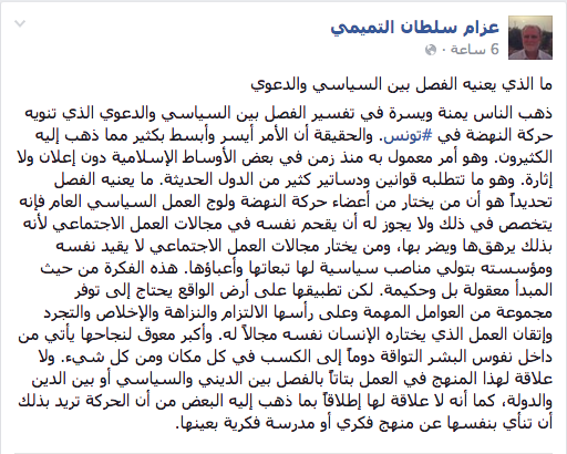 وقال “التميمي”، خلال منشور له عبر صفحته الشخصية على موقع التواصل الاجتماعي “فيس بوك”، ما يعنيه الفصل تحديدًا هو أن من يختار من أعضاء “حركة النهضة” ولوج العمل السياسي العام فإنه يتخصص في ذلك ولا يجوز له أن يقحم نفسه في مجالات العمل الاجتماعي لأنه بذلك يرهقها ويضر بها، ومن يختار مجالات العمل الاجتماعي لا يقيد نفسه ومؤسسته بتولي مناصب سياسية لها تبعاتها وأعباؤها.