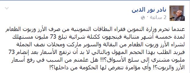 وأضاف “نور الدين” “وبالتالي لا بد أن ترتفع الأسعار بعد انضام 73 مليون مشترٍ إلى سلع الأسواق؟!! هل علمتم من السبب في رفع أسعار الأرز والزيوت؟! وأي مؤامرة تتعرض لها الحكومة من داخلها؟!“.