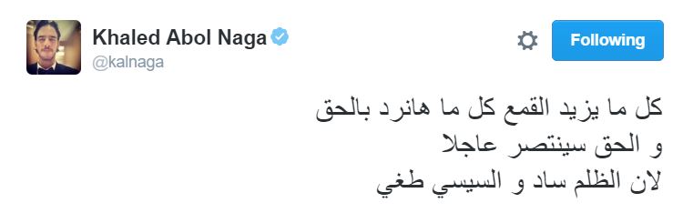 وقال -عبر تغريدة له على “تويتر”-: “كل ما يزيد القمع كل ما هانرد بالحق.. والحق سينتصر عاجلًا لأن الظلم ساد والسيسي طغى”.