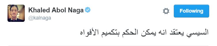 وأضاف “أبو النجا” -في تغريدة أخرى- “السيسي يعتقد أنه يمكن الحكم بتكميم الأفواه”.