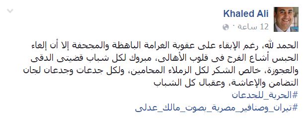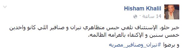 وكتب الباحث الاقتصادي هشام خليل: “خبر حلو، الاستئناف تلغي حبس متظاهري تيران وصنافير اللي كانوا واخدين خمس سنين والاكتفاء بالغرامة الظالمة”.