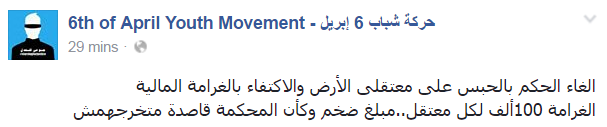 وقالت حركة 6 أبريل -عبر منشور لها على “فيسبوك”-: “إلغاء الحكم بالحبس على معتقلي الأرض والاكتفاء بالغرامة المالية الغرامة 100 ألف لكل معتقل، مبلغ ضخم وكأن المحكمة قاصدة متخرجهمش”.