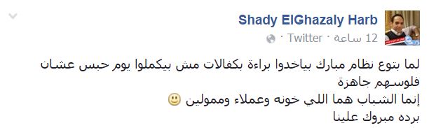 وندد الناشط السياسي شادي الغزالي حرب، بخروج رموز نظام المخلوع حسني مبارك، بعد يوم من إخلاء سيبلهم لتوافر ثمن الغرامات لديهم، بينما يستمر حبس الشباب.