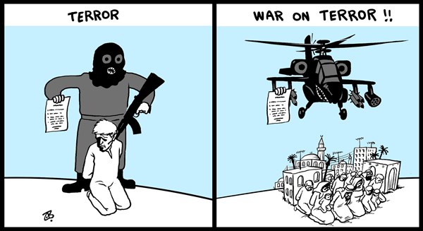 وركز موقع “بلوتيكال كارتونز” على الفرق بين الإرهاب والحرب على الإرهاب.