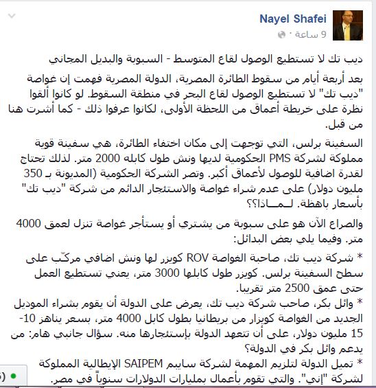 قال نائل الشافعي، مدير موسوعة “معرفة” الإلكترونية، إنه بعد أربعة أيام من سقوط الطائرة المصرية، فهمت الدولة المصرية أن غواصة “ديب تك” لا تستطيع الوصول لقاع البحر في منطقة السقوط.