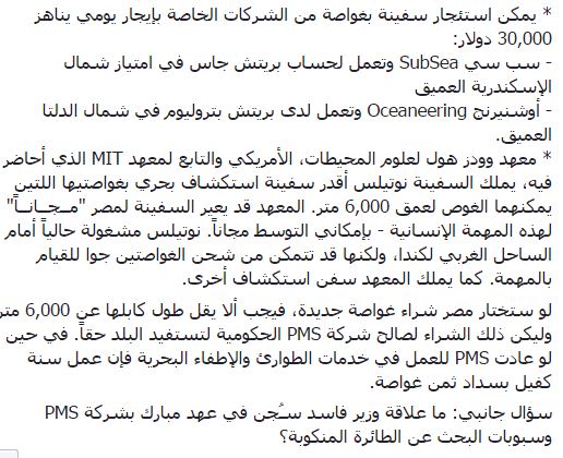 – وائل بكر، صاحب شركة ديب تك، يعرض على الدولة أن يقوم بشراء الموديل الجديد من الغواصة كويزار من بريطانيا بطول كابل 4000 متر، بسعر يناهز 10-15 مليون دولار، على أن تتعهد الدولة باستئجارها منه. وتساءل “الشافعي”: “من يدعم وائل بكر في الدولة؟”.