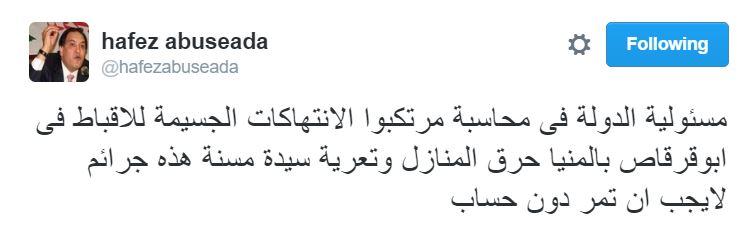 وقال -عبر تغريدة له على “تويتر”-: “مسؤولية الدولة في محاسبة مرتكبي الانتهاكات الجسيمة للأقباط في أبو قرقاص بالمنيا.. حرق المنازل وتعرية سيدة مسنة هذه جرائم لا يجب أن تمر دون حساب”.