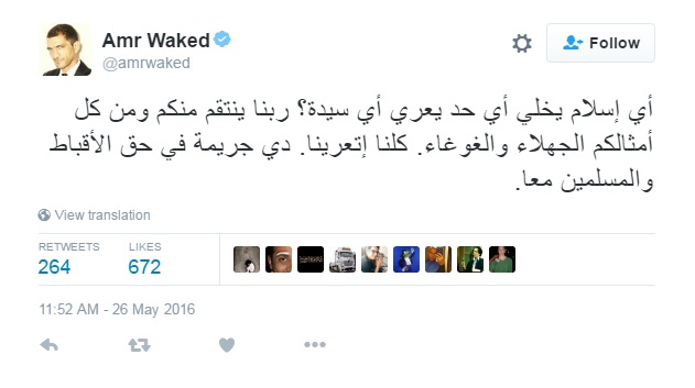 وأكد “واكد” في تغريدة له عبر صفحته الشخصية على تويتر، “أن الحادث يعد جريمة في حق الأقباط والمسلمين معًا”.