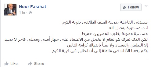 وكتب فرحات في منشور له عبر صفحته الشخصية بموقع التواصل الاجتماعي “فيس بوك”: “سيدتي الفاضلة ضحية العنف الطائفى بقرية الكرم أنت مستورة بفضل الله.. مستترة مصونة بقلوب المصريين جميعًا، لكن الذى تعرى هو نظام لا يخجل من الاعتماد على جهاز أمني ومحلي فاجر لا يجيد إلا البطش والفساد ولا يعبأ بانتهاك كرامة الناس.. وكم رفعنا الآذان في مالطة إلى أن انطلق في قرية الكرم”.