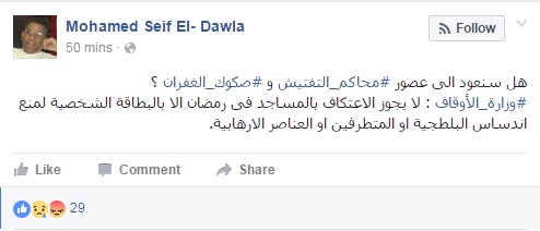 وتسأل سيف الدولة في منشور له عبر حسابه الشخصي على موقع التواصل الاجتماعي “فيس بوك”، بعد قرارات منع الاعتكاف بالمساجد في رمضان إلا بالبطاقة الشخصية: “هل سنعود إلى عصور محاكم التفتيش وصكوك الغفران؟”.