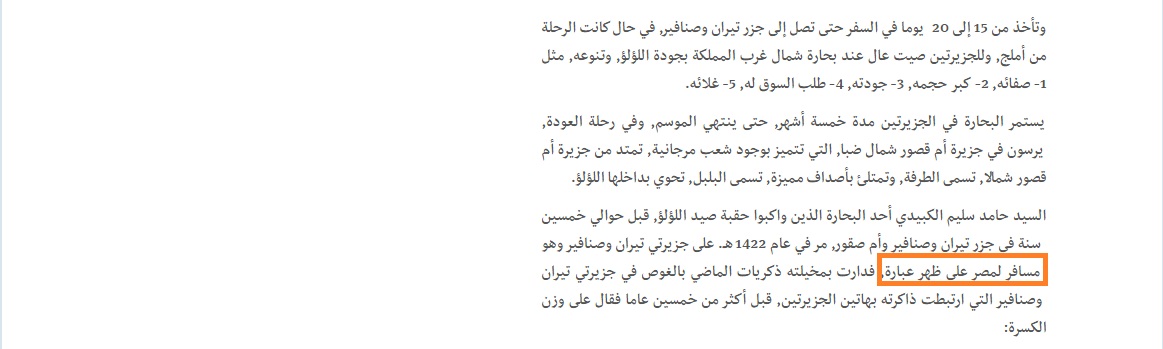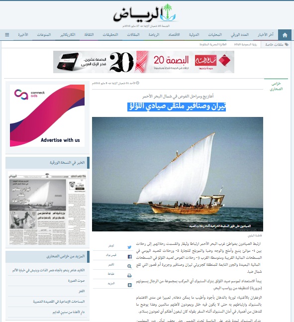 ونَشرت الصحيفة السعودية الشهيرة، تقريرًا مصورًا تحت عنوان “تيران وصنافير ملتقى صيادي اللؤلؤ”، واستعرضت من خلاله رحلات الصيادين إلى الجزيرتين لاصطياد اللؤلؤ، الذي يعد من أجود الأنواع.