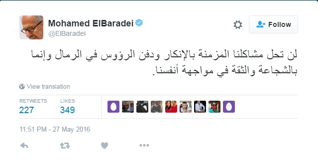 وكَتب البرادعي في تدوينة له عبر حسابه الرسمي على موقع التدوين المصغر “تويتر”: “لن تحل مشاكلنا المزمنة بالإنكار ودفن الرؤوس في الرمال”، وأضاف: “وإنما بالشجاعة والثقة في مواجهة أنفسنا”.