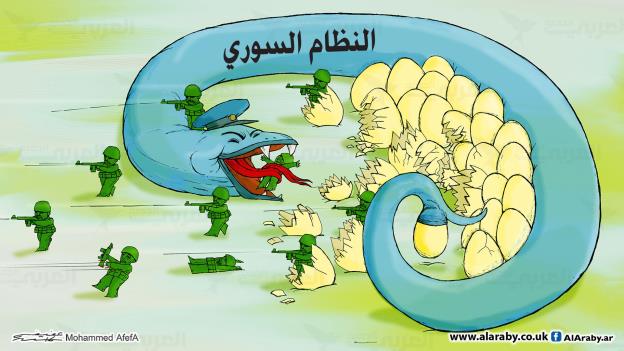 – وعبر موقع “العربي الجديد” برسم ساخر عن علاقة النظام السوري بجيشه.