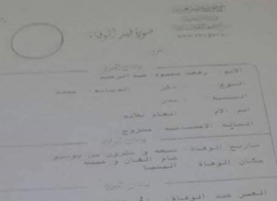 وأظهرت الصورة الشهادة أن المتهم، رفعت محمود عبدالرحيم، أحد المطلوبين بشأن أحداث فتنة الكرم والاشتباكات التي وقعت بين مسلمين وأقباط، متوفى منذ عام 2005م.