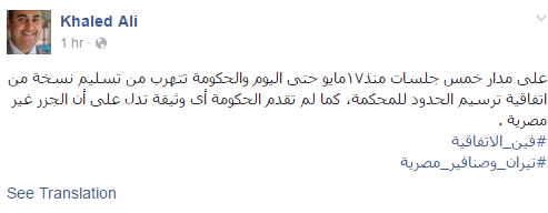 وقال على حسابه الشخصي بموقع التواصل الإجتماعي “فيس بوك”: “على مدار خمس جلسات منذ١٧مايو، وحتى اليوم، والحكومة تتهرب من تسليم نسخة من اتفاقية ترسيم الحدود للمحكمة، كما لم تقدم الحكومة أي وثيقة تدل على أن الجزر غير مصرية”.
