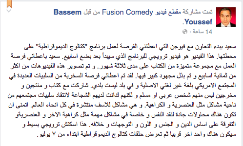 ونشر “يوسف” -عبر صفحته على “فيس بوك”- مقطع فيديو وعلق عليه بقوله: “هذا الفيديو هو فيديو ترويجي للبرنامج الذي سيبدأ بعد بضع أسابيع، سعيد باعطائي فرصة العمل مع مجموعة متميزة من الكتاب على مدى ثلاثة شهور، وتم تصوير هذه الفيديوهات من أكثر من ثمانية أسابيع وتم بذل مجهودًا كبيرًا فيها، لقد تم إعطائي فرصة السخرية من السلبيات العديدة في المجتمع الأميركي بلغة غير لغتي الأصلية وفي بلد ليست بلدي”.