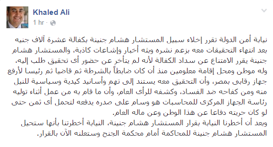 وقال خالد علي في منشور له عبر حسابه الشخصي على موقع “فيس بوك”: “نيابة أمن الدولة تقرر إخلاء سبيل المستشار هشام جنينة بكفالة عشرة آلاف جنيه بعد انتهاء التحقيقات معه بزعم نشره وبثه أخبار وإشاعات كاذبة”.