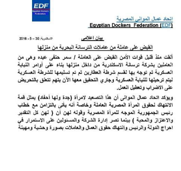 وأكد اتحاد عمال الموانئ في بيان له، أن هذا التصعيد لامرأة جِدَّة، ولها أحفاد يمثل قمة الانتهاك لحقوق المرأة المصرية العاملة، خاصة أنه يأتى بالتزامن مع خطاب “رئيس الجمهورية” الموجه للمرأة المصرية وقوله لهن أن (لهن كل التقدير والاعتزاز والمحبة) بينما تصر إدارة الشركة والمسئولين على الاستمرار في إحراج الدولة والرئيس وانتهاك حقوق العمال والعاملات بصورة وحشية ومهينة.