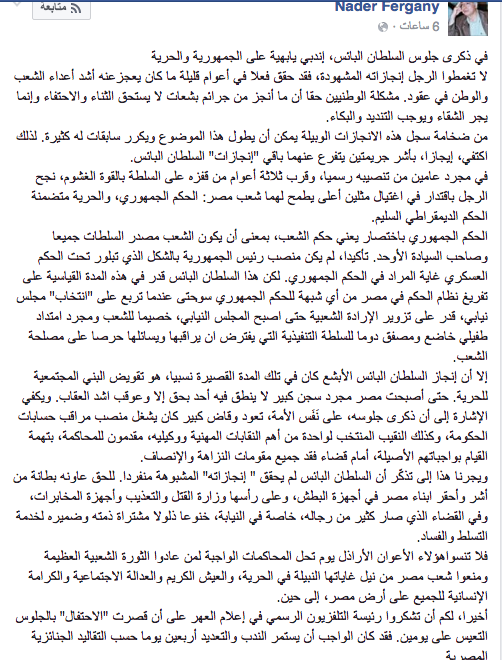 وتابع :”من ضخامة سجل هذه الإنجازات الوبيلة يمكن أن يطول هذا الموضوع ويكرر سابقات له كثيرة، لذلك اكتفي، إيجازا، بنشر جريمتين يتفرع عنهما باقي “إنجازات” السلطان البائس،  حيث نجح الرجل باقتدار في اغتيال مثلين أعلى يطمح لهما شعب مصر: الحكم الجمهوري، والحرية” .