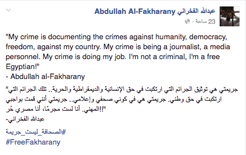 قال عبدالله الفخراني، عضو مجلس إدارة شبكة “رصد”: “إن جريمتي هي توثيق الجرائم التي ارتكبت في حق الإنسانية والديمقراطية والحرية.. تلك الجرائم التي ارتكبت في حق وطني.