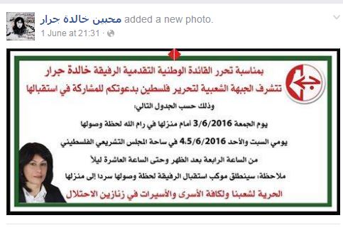 ودعت الجبهة الشعبية لتحرير فلسطين للمشاركة في استقبال والاحتفال بالناشطة خالدة جرار، فور الإفراج عنها.