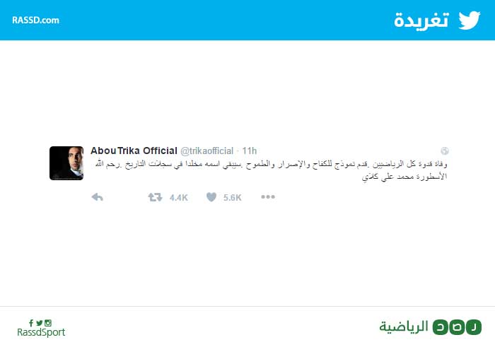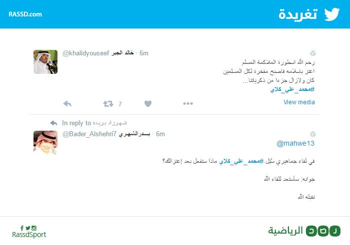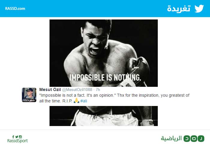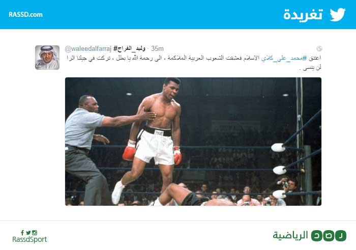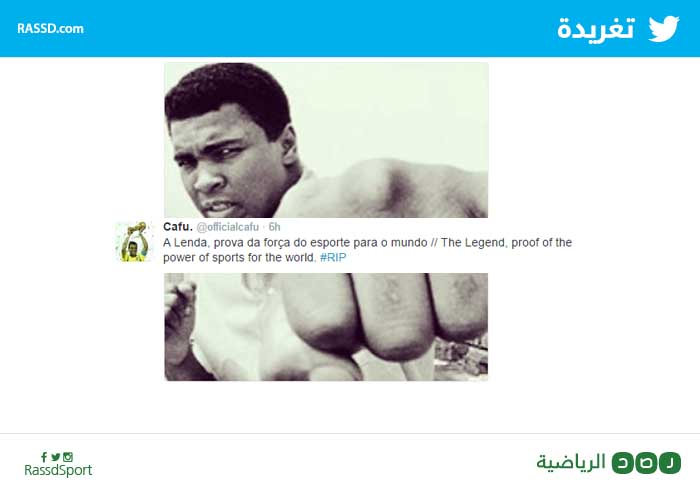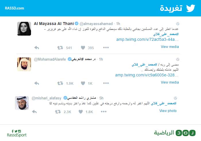 وأثرت وفاة البطل الشهير في الكثير من المشاهير وغيرهم، وليس في الأوساط الرياضية وحسب، ونشر العديد من مشاهير الرياضة والدين وغيرهم، تغريدات عبر موقع التواصل الإجتماعي “تويتر” ينعون فيها وفاة الأسطورة الراحل، مبرزين فيها كلماته عن التحدي والمثابرة والاجتهاد، ومدى اعتزازه وفخره بدينه داخل وخارج الحلبة.