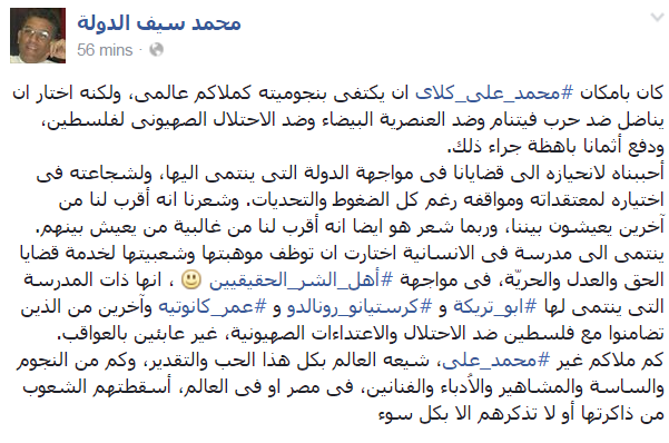وكتب في تدوينة على حسابه بموقع التواصل الاجتماعي “فيس بوك”: “كان بإمكان محمد علي كلاي أن يكتفي بنجوميته كملاكم عالمي، ولكنه اختار أن يناضل ضد حرب فيتنام وضد العنصرية البيضاء وضد الاحتلال الصهيوني لفلسطين، ودفع أثمانًا باهظة جراء ذلك”.