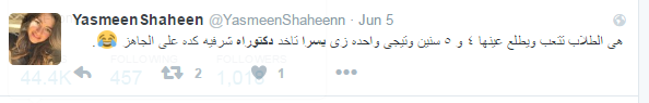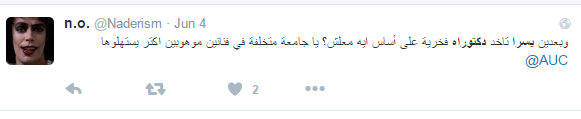 وعلقت الناشطة الحقوقية نيفين ملك على ذلك الحدث قائلة:”هذا هو الطبيعي، فالنظام يتوافق مع الفنانين والفنانات، لذلك تبحث الجامعات الخاصة التي تعمل تحت رعايته بتكريم هؤلاء الفنانين، بينما العلماء والمفكرين لم يصبح لهم مكان في دولة الظلم والقمع والجهل”.