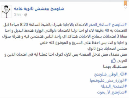 نشرت صفحة “شاومينج بيغشش ثانوية عامة” على موقع “فيس بوك”، مساء اليوم الإثنين، إنذارًا بأنه سيجري تسريب امتحان اللغة الإنجليزية لطلاب الثانوية العامة، المقرر إجراؤه، صباح غدًا الثلاثاء، قبل موعده بـ45 دقيقة، وذلك في تحدي جديد للدولة، وبعد أقل من 48 ساعة من تسريب امتحاني اللغة العربية والتربية الدينية.