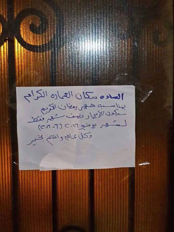 انتشر على مواقع التواصل الاجتماعي “فيس بوك” و “تويتر” ملصقًا وضعه أحد مالكي العقارات على بوابة المنزل، يبلغ فيه قاطني العقار بأنه سوف يخفض الإيجار خلال شهر يوينو بمناسبة شهر رمضان، ويهنئهم بقدومه.